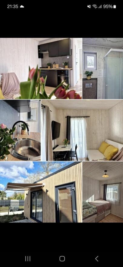 Domek ma 2 jasne pokoje: sypialnia i pokój dzienny z dużym telewizorem oraz wyjściem na taras i aneksem kuchennym. Widna łazienka /prysznic, pralka, umywalka z lustrem, aneks kuchenny /lodówka z oddzielnym zamrażalnikiem, kuchenka, czajnik elektr., szafki wysokiej klasy robione na wymiar z cichym domykiem.