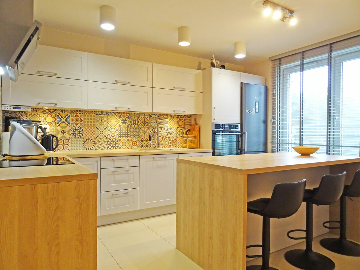 Kuchnia – glazura na posadce, meble w zabudowie, wyspa, 3x hoker, lodówka Hotpoint Aryston, zmywarka Bosch, piekarnik Electrolux, indukcja Bosch, okap Akpo,