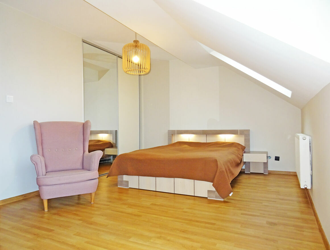 Pokój 3 sypialnia - panele na posadzce, łóżko, fotel, szafa, szafa w zabudowie, zasłony zaciemniające, klimatyzacja Gree