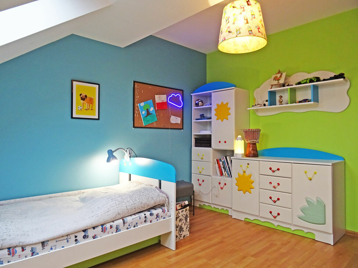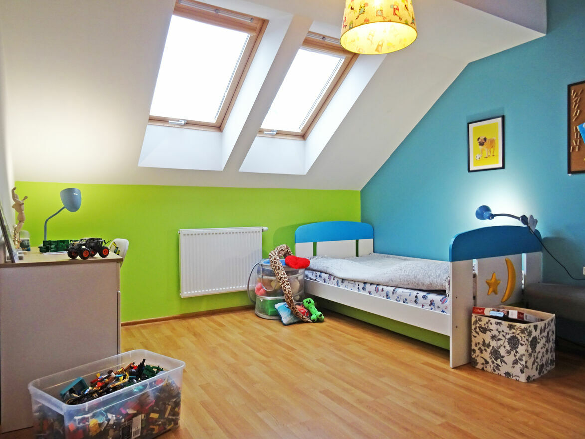 Pokój 2 – panele na posadzce, łóżko dziecięce, biurko dziecięce, 2x regał, półka