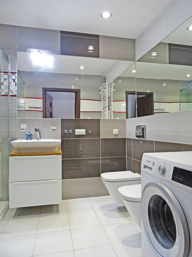 Łazienka – glazura na posadzce i ścianach, duży prysznic, zlew + szafka, toaleta, bidet, zestawy podtynkowe, suszarka Candy, pralka Siemens