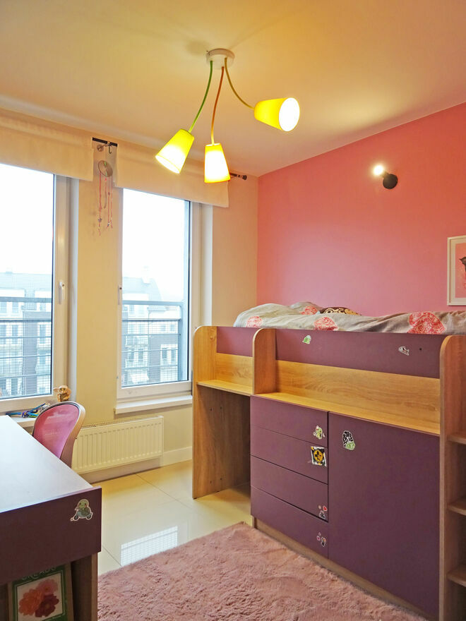 Pokój 1 - glazura na posadzce, łóżko podwyższone dziecięce, biurko dziecięce, regał