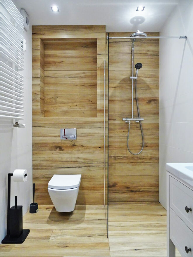 Łazienka - posadzka i ściany płytki gresowe, umywalka z baterią, szafka z lustrem, przestrzenny wygodny prysznic z odpływem liniowymi, deszczownicą i ścianką szklaną, pralka, ustęp w zabudowie, oświetlenie LED,