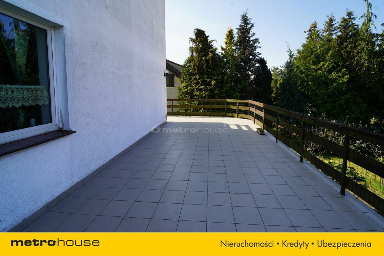 Na tym poziomie mieści się również łazienka oraz duży pokój z aneksem kuchennym, z którego prowadzi bezpośrednie wyjście na imponujący taras o powierzchni 49 m². Taras oferuje piękny widok na zadbany ogród i stanowi idealne miejsce do relaksu, spotkań rodzinnych oraz wypoczynku na świeżym powietrzu.