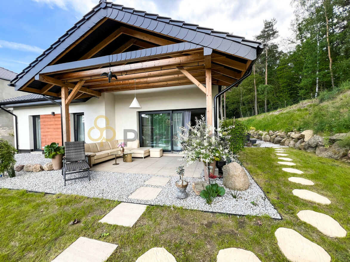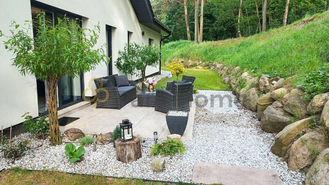 Otoczony lasem i zielonym ogrodem dom, stwarza unikalne miejsce, gdzie codzienne życie splata się z naturą. Ogród został podzielony na dwieczęści: górną - zalesioną ( gdzie rosną grzyby, można urządzić dzieciom domki na drzewach lub zawiesić hamaki ) i dolną zdobioną krzewami i drzewkami oraz trawnika.
