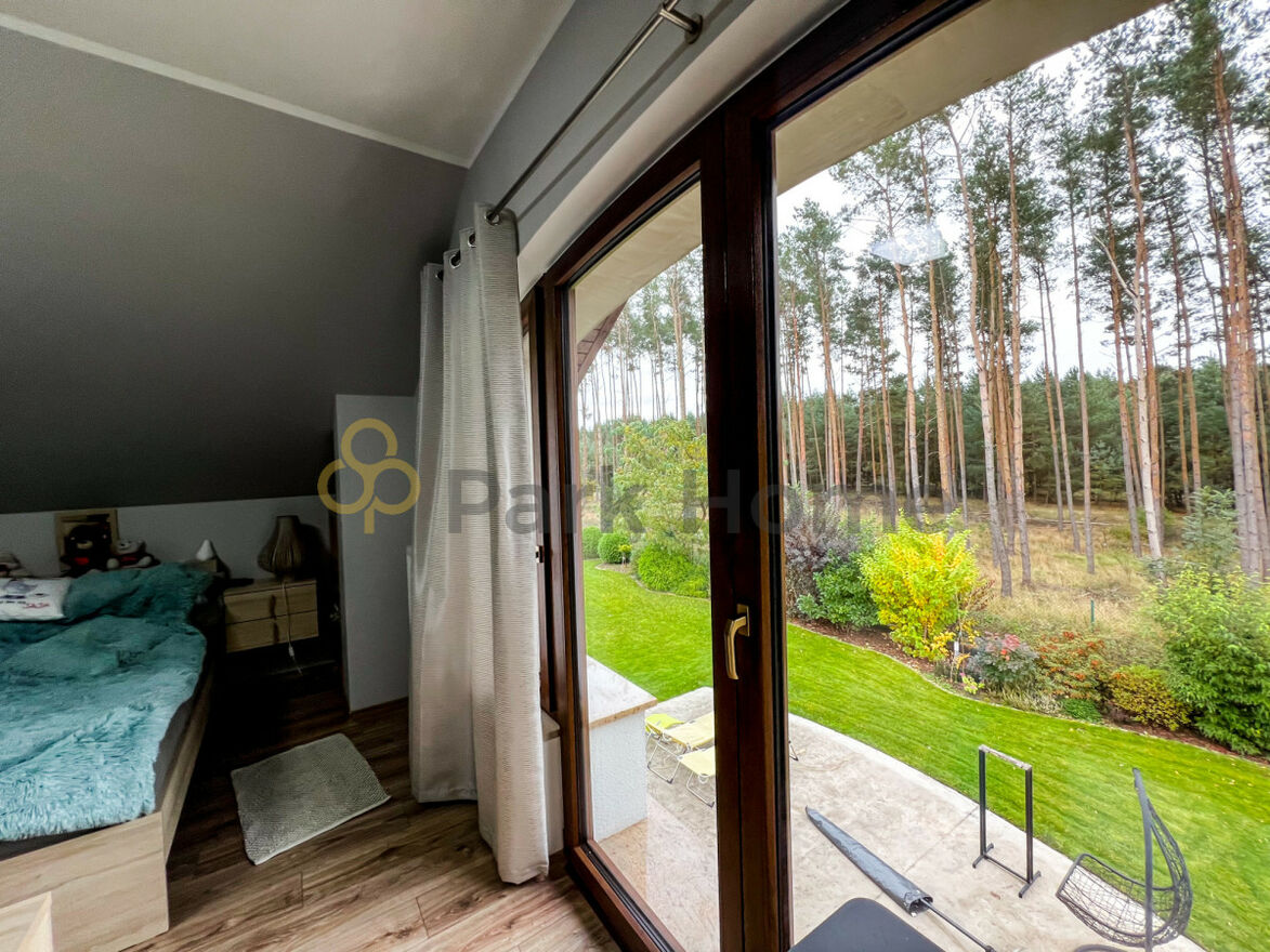 Wnętrze domu to przestronny salon z wyjściem na 80 metrowy taras, jasna kuchnia , jadalnia oraz 5 sypialni z garderobami. Pokoje niezwykle przestronne, dające wiele możliwości aranżacji. Bogato wyposażona kuchnia, z nowoczesnymi urządzeniami AGD. Dodatkowym atutem jest połączenie kuchni z jadalnią, do której przez liczne okna wpada wiele światła, a widok lasu zza okien cieszy zmysły podczas celebracji posiłków.