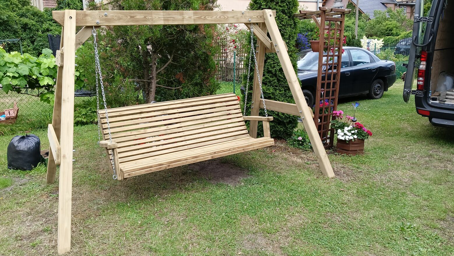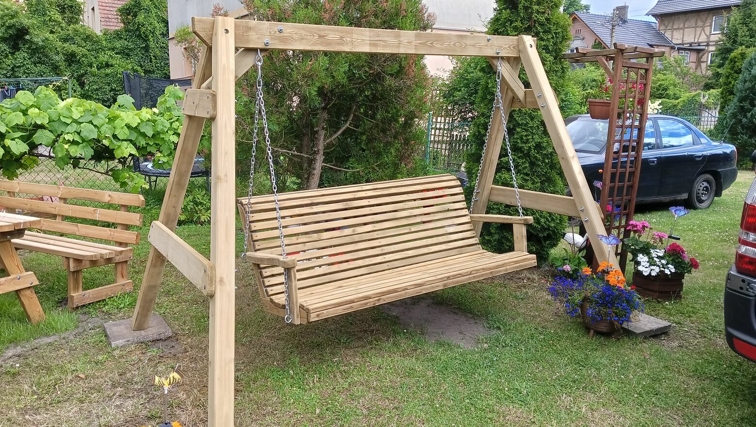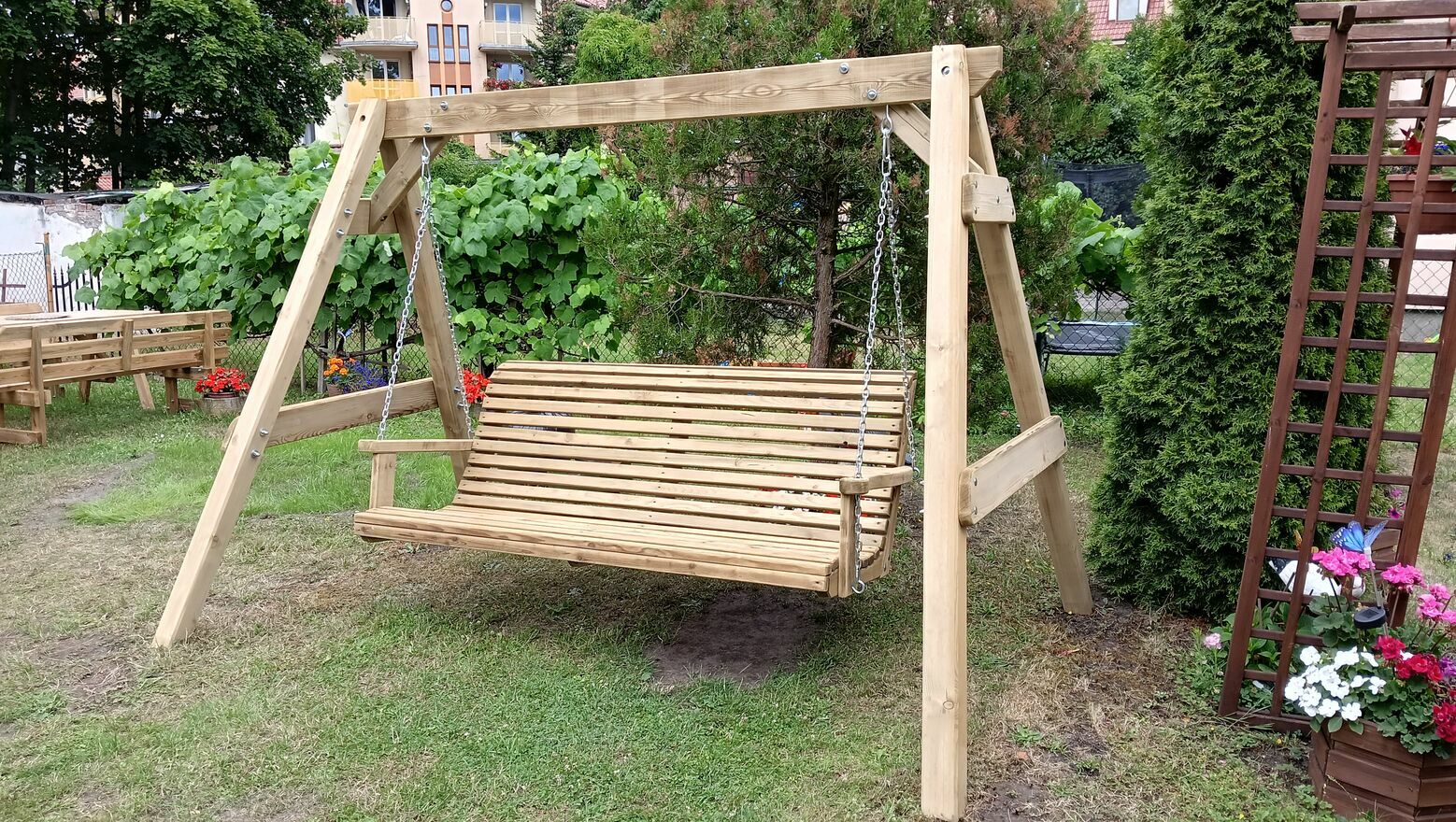 huśtawka ogrodowa z ławką.