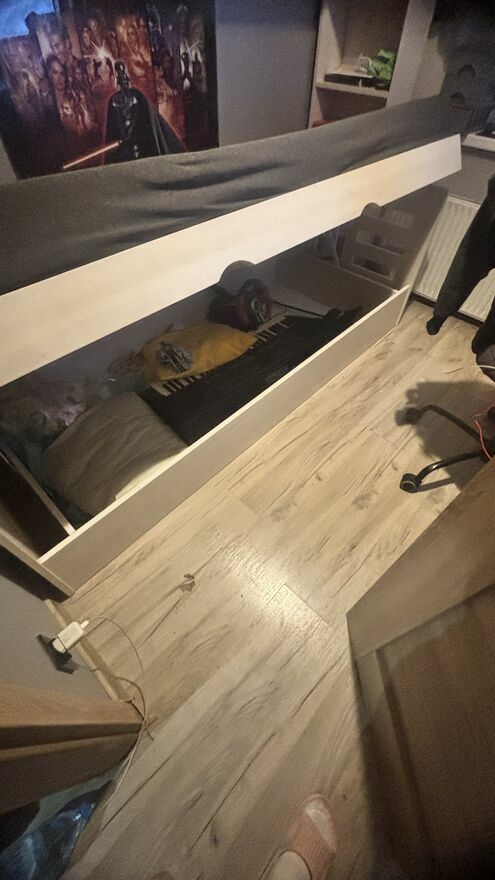 Solidne, drewniane łóżko z litego drewna brzozowego z oparciem z tyłu i po bokach. Podnoszony stelaż z podnośnikiem gazowym .Powierzchnia spania 80x200 z materacemSprawdź zainteresowanie tym ogłoszeniem