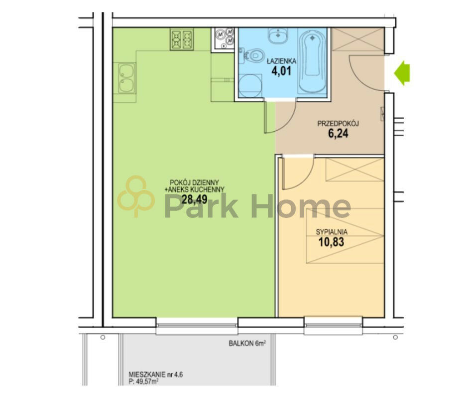 W mieszkaniu wyznaczono dwa pokoje: sypialnię i salon. Okna oraz balkon wychodzą na wschód. Poza tym w mieszkaniu znajdziemy wyznaczoną łazienkę i przedpokój.