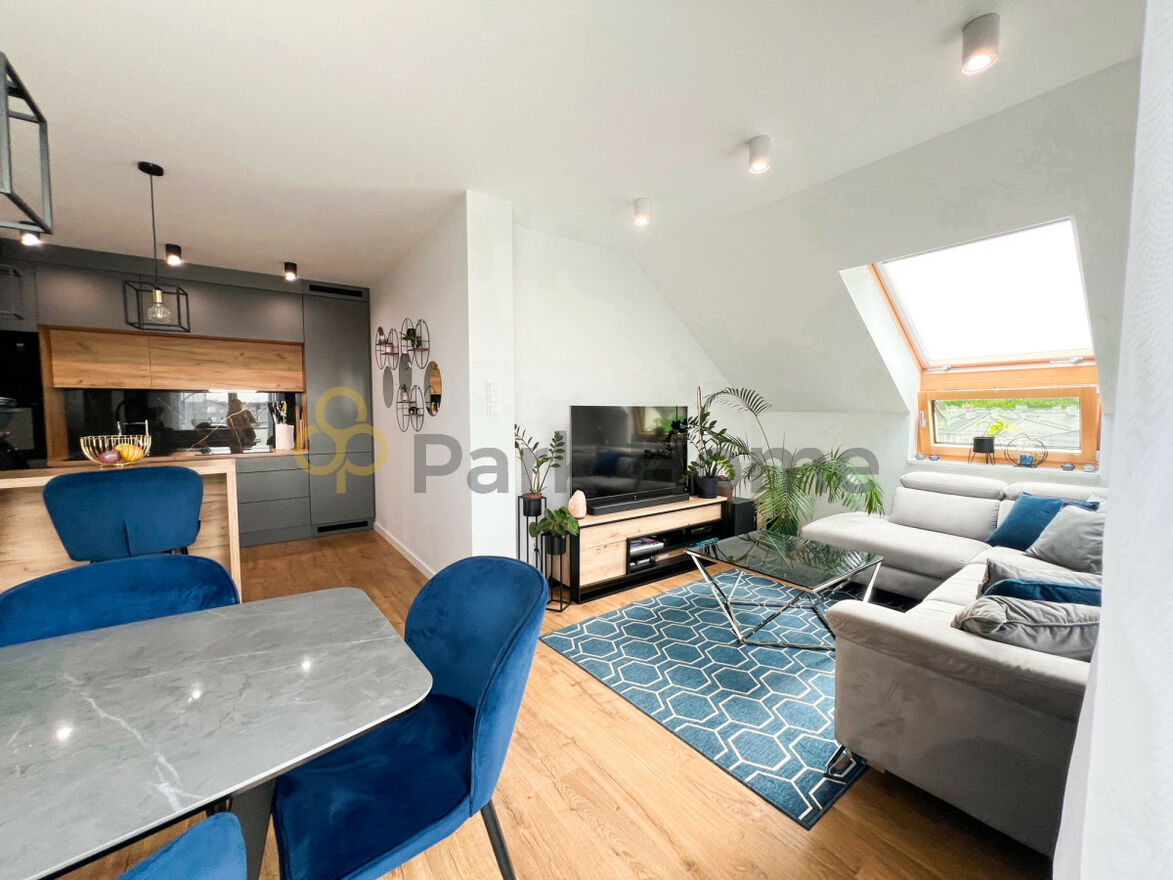 Widoczne na zdjęciu skosy w salonie zaczynają się od wysokości 1,30m, a przestrzeń pod nimi zagospodarowana jest na narożnik, dzięki czemu zyskujemy na metrażu rzeczywistym. "Po podłodze" mieszkanie ma kilka dodatkowych metrów więcej.
