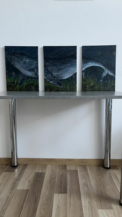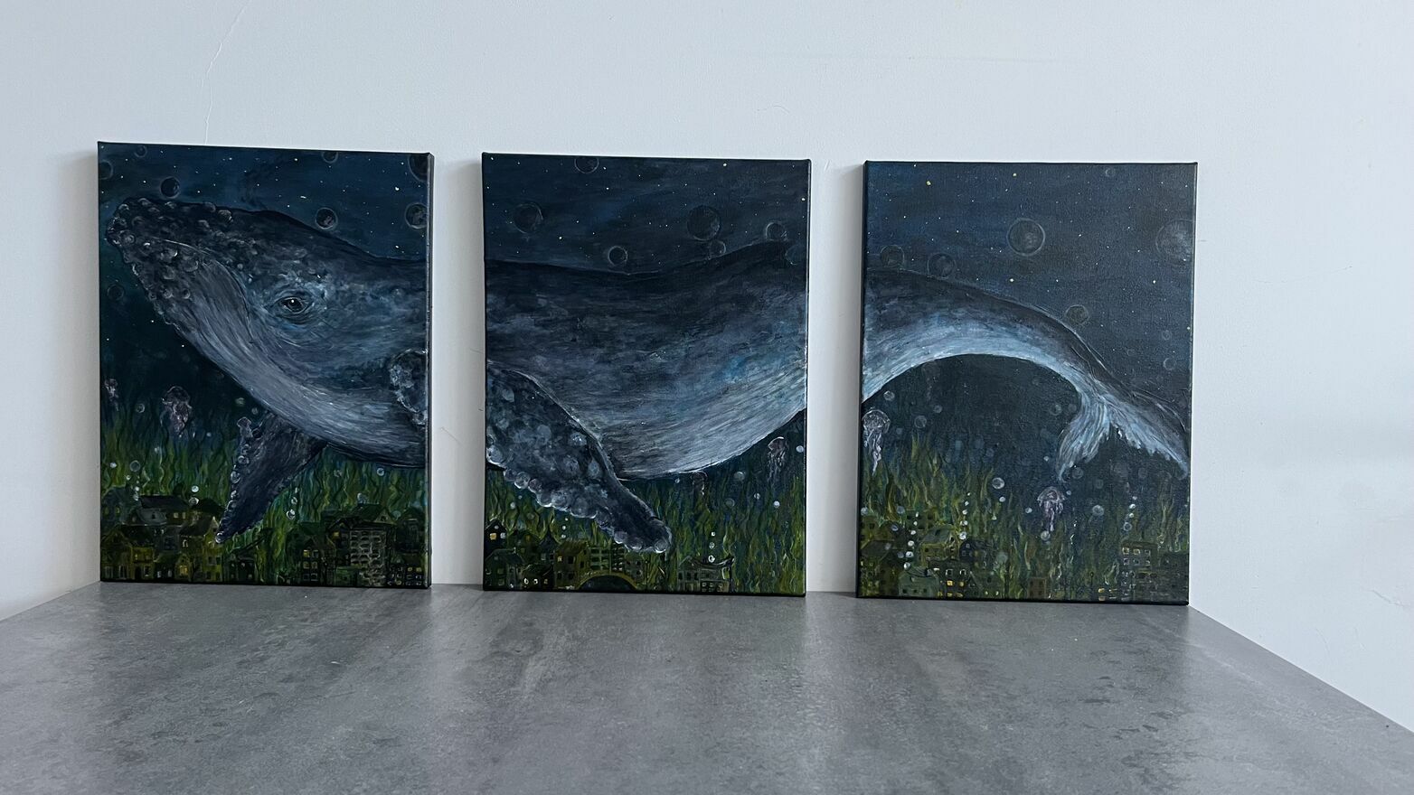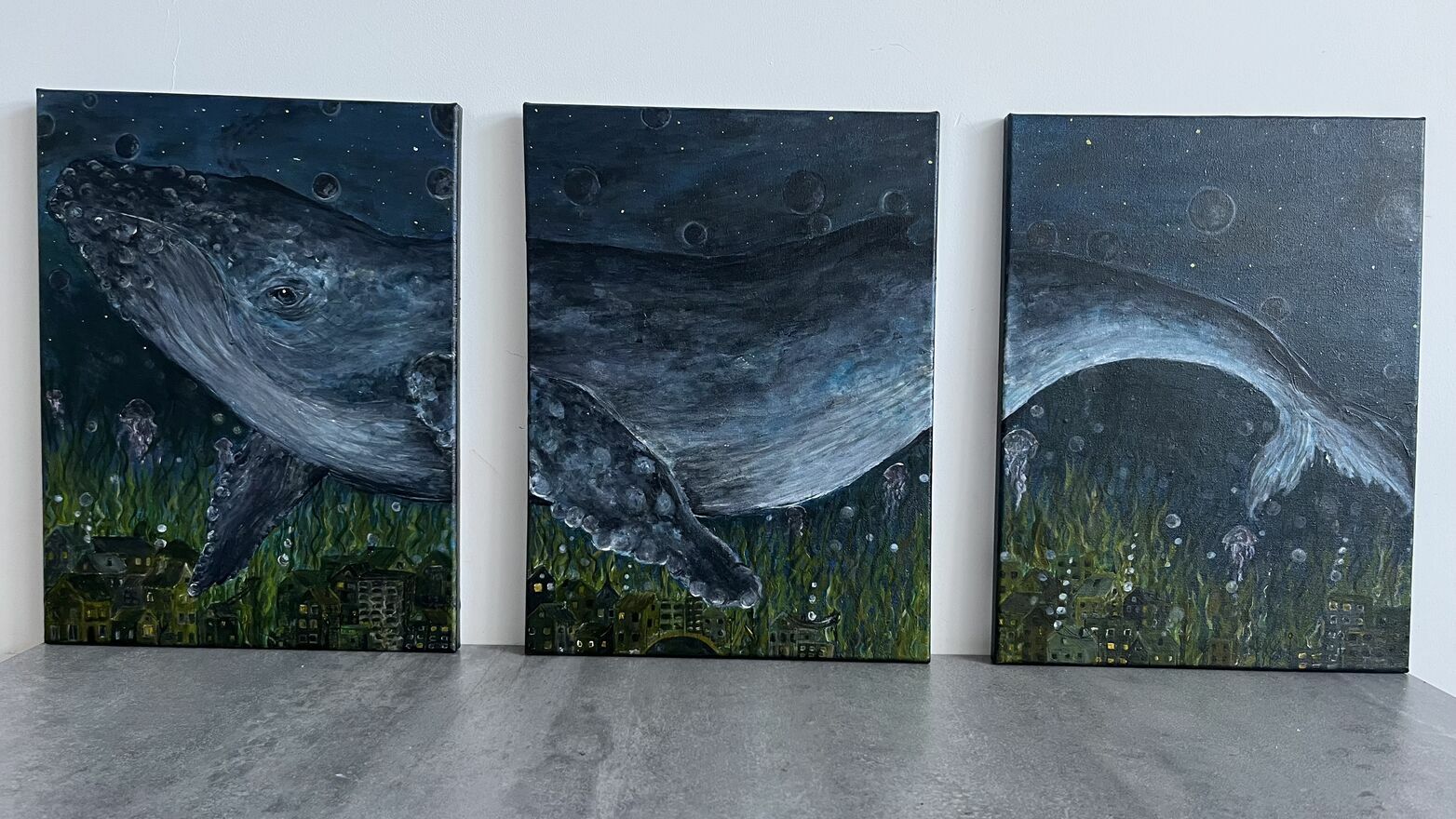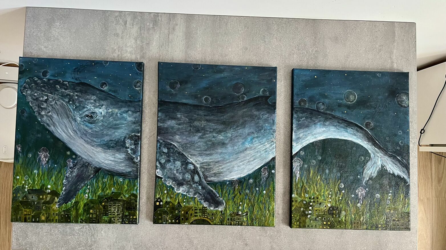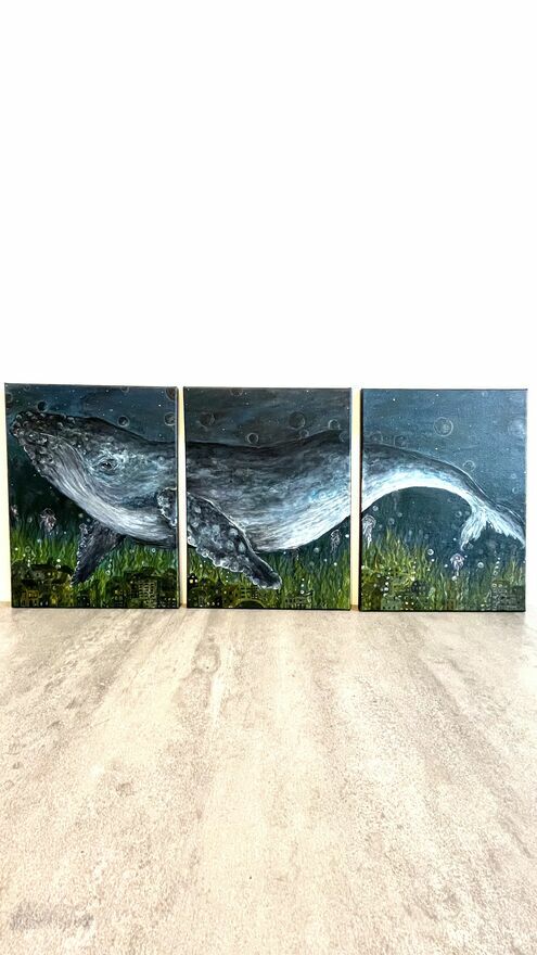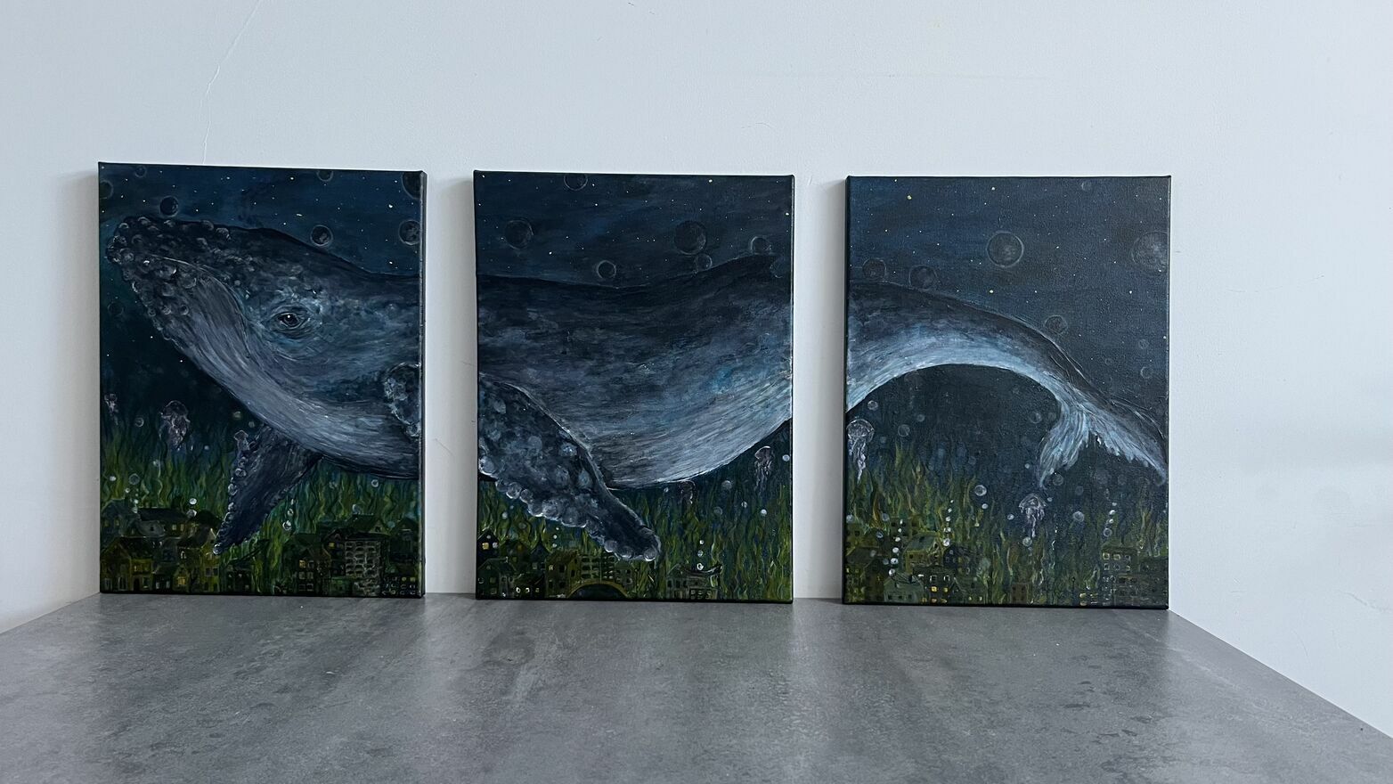 „Urbanizacja wdziera się w przestrzeń ciszy” to tryptyk akrylowy, w którym monumentalny wieloryb staje się strażnikiem głębin i symbolem pierwotnej harmonii. Jego spokojny, majestatyczny ruch kontrastuje z zatopionym miastem u stóp oceanu – miastem, które wciąż próbuje istnieć w świecie, gdzie cisza i natura były pierwsze.