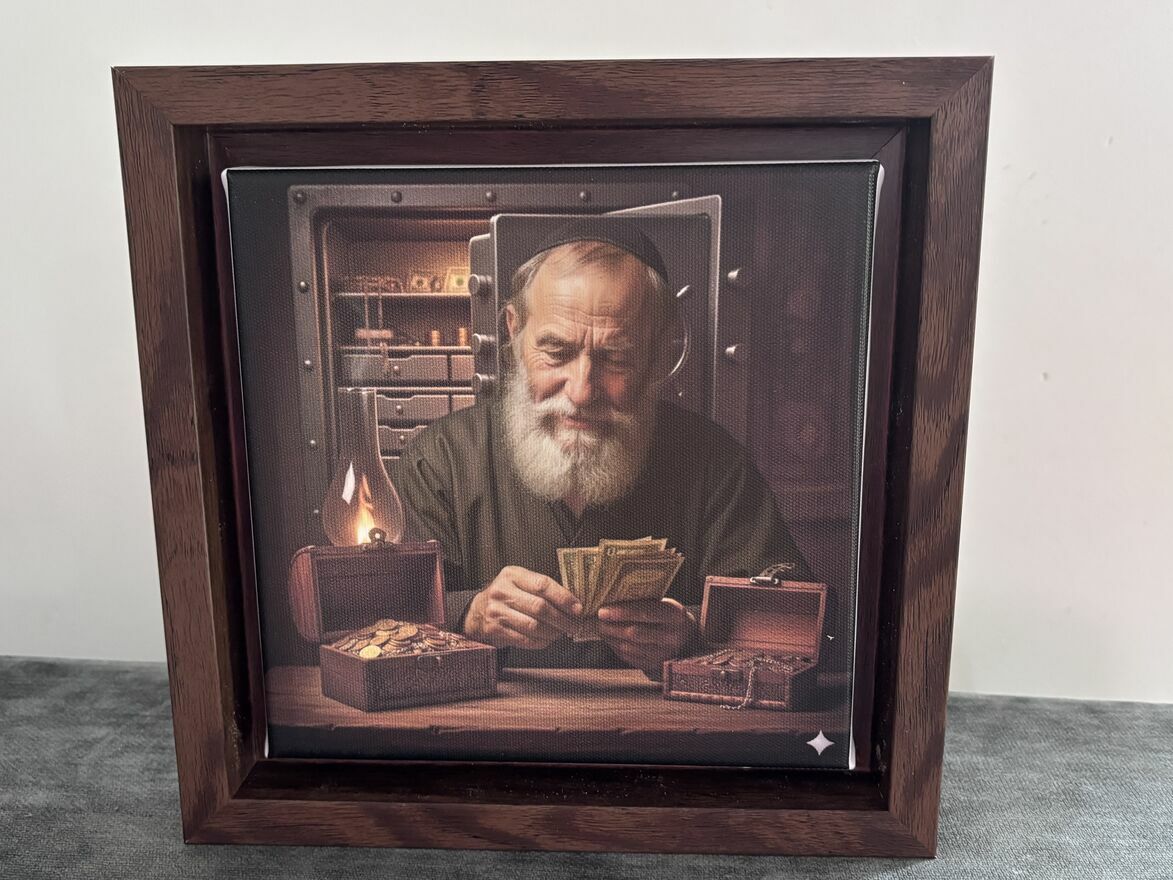 Obraz Żyda na płótnie w rozmiarze 26 cm x 26 cm. Rama w kolorze orzech. Obraz Żyda z banknotami ma przynieść domownikom szczęście, dostatek i szczęście w interesach. Kiedy rok dobiega końca, portret jest odwracany do góry nogami, aby Żyd zgubił pieniądze i w przyszłym roku liczył je na nowo.Ponadto powinien on wisieć przy wejściu do domu i być odwracany albo w piątek (szabas) albo pod koniec roku, tak aby sakiewka na Nowy Rok mogła się ponownie zapełniać.