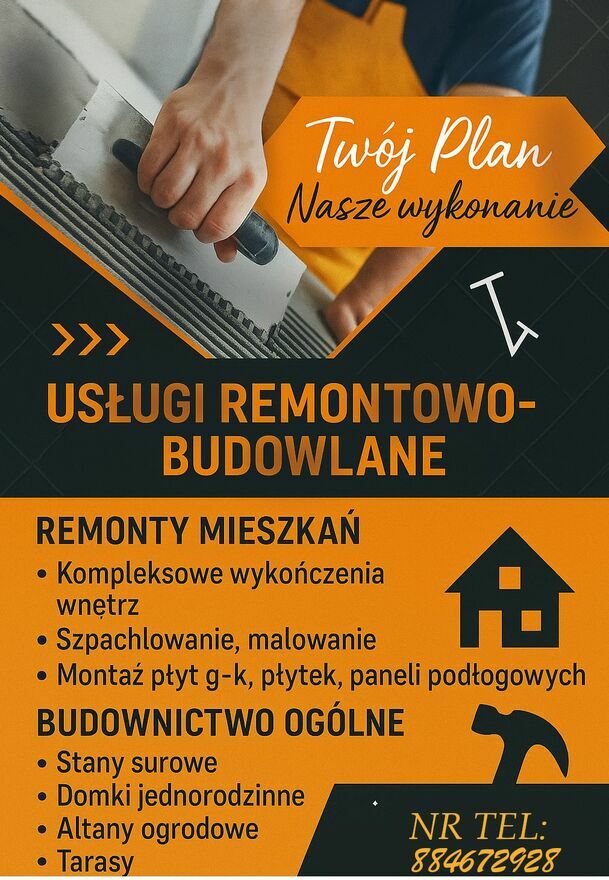 Profesjonalne usługi remontowo-budowlaneOferuję kompleksowe usługi remontowo-budowlane dla mieszkań, domów oraz lokali użytkowych. Realizuję zarówno pełne remonty, jak i pojedyncze prace wykończeniowe – rzetelnie, terminowo i z dbałością o detale.