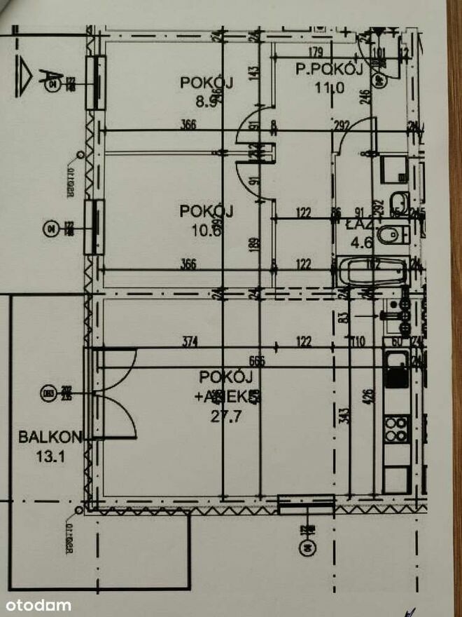 - Przestronny salon z aneksem kuchennym (27,7) i wyjściem na balkon 13,1 m²